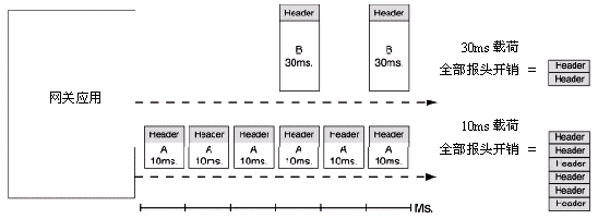 在一個減少發(fā)話方和受話方間音頻反應(yīng)時間的努力中,VoIP網(wǎng)關(guān)通常會配置成發(fā)送較小的語音數(shù)據(jù)載荷。雖然這樣做通常可以減少聽得見的傳輸延遲,但同時也增加了一個給定語音數(shù)據(jù)流需要傳遞的包的數(shù)量。因為不管多小的音頻載荷都需要一個固定大小的包報頭,網(wǎng)上需要傳遞的數(shù)據(jù)量越大這個效果越明顯──跟隨的是網(wǎng)絡(luò)包和數(shù)據(jù)流量的相應(yīng)增長。圖1說明了用于傳輸包報頭的帶寬會隨著包載荷大小的縮小而增大。