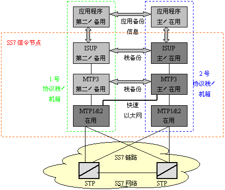 只有SS7鏈路出現(xiàn)故障時(shí),SS7協(xié)議才有相應(yīng)的規(guī)則去處理故障,對其它故障的處理必須在設(shè)計(jì)SS7平臺(tái)和整個(gè)系統(tǒng)結(jié)構(gòu)時(shí)予以考慮。還有一個(gè)普遍的要求是:軟件的升級(jí)過程中不能影響整個(gè)系統(tǒng)的運(yùn)行。能達(dá)到以上要求的一個(gè)解決方案是:使用兩個(gè)主機(jī)箱,在每個(gè)主機(jī)箱里插有SS7接口板,用于支持一條或多條SS7鏈路。讓兩個(gè)主機(jī)都使用一個(gè)SS7地址,也就是共用一個(gè)信令點(diǎn)編碼,這樣遠(yuǎn)端的交換機(jī)或STP就會(huì)認(rèn)為這兩個(gè)主機(jī)是一個(gè)完整的系統(tǒng)。這樣,這兩個(gè)主機(jī)組成的系統(tǒng)就能在其中一個(gè)出現(xiàn)故障時(shí)仍能正常工作。