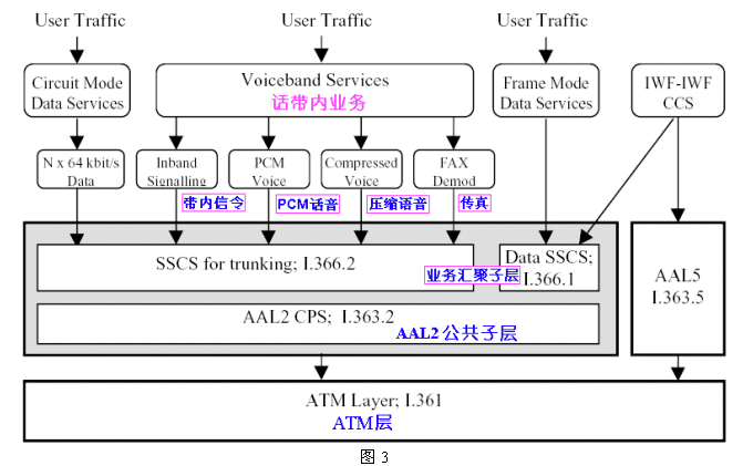 下圖3給出了VoATM的協(xié)議結(jié)構(gòu)模型(來源:AF-VMOA-0145-000:ATM論壇ATM Forum)。這是一個基于AAL2進行話帶話音及多媒體業(yè)務(wù)傳送的協(xié)議框架。在ATM論壇標準中,被稱為環(huán)路仿真業(yè)務(wù)(LES:Loop Emulation Service),和傳統(tǒng)PSTN不同的是采用很大新技術(shù)以充分利用傳送帶寬: