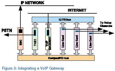 其它新業(yè)務(wù),例如IP話(huà)音(VoIP),如果要達(dá)到理想的性能,就需要電信系統(tǒng)內(nèi)部的集成,增加一塊網(wǎng)關(guān)板卡,作為附屬在CompactPCI總線和H.110總線上的外圍設(shè)備,F(xiàn)在,有了額外硬件(網(wǎng)關(guān)板卡)和VoIP的額外軟件,充分利用VoIP性能就成為可能(圖3)。