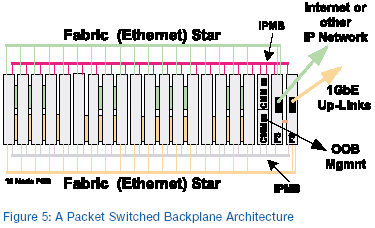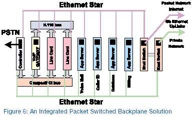 圖6的設(shè)置表明,在一個(gè)集成的分組交換底板解決方案中,這種最開(kāi)始基于幾種不同機(jī)箱而開(kāi)發(fā)的解決方案可能看起來(lái)象什么。建立在CompactPCI