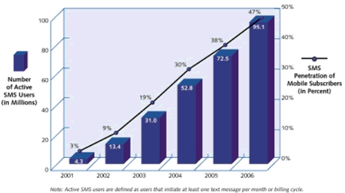 SMS在美國的使用落后于歐洲和日本, 但是工業(yè)分析是預(yù)測(cè)它會(huì)很快地趕上來. 請(qǐng)見圖1. 活躍的SMS用戶預(yù)計(jì)會(huì)從2002年的9%增加到2006年的47%.