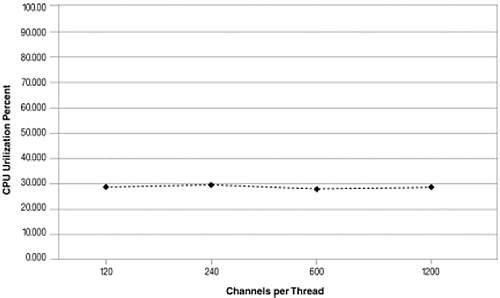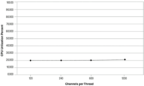 擴展異步模式使用了36%到28%. 系統(tǒng)顯示了很高的擴展性, CPU使用率和通道數(shù)成線形增長.