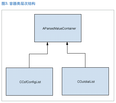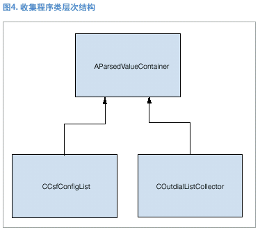 AparsedValueContainer類(lèi)沒(méi)有數(shù)據(jù)和方法。它僅用于配合收集程序類(lèi)的運(yùn)行。(見(jiàn)圖3。)抽象收集程序類(lèi)純虛擬功能CollectValues()的第二個(gè)影響因素是容器,當(dāng)在具體收集程序類(lèi)實(shí)施中定義了容器時(shí),必須使用通用的基礎(chǔ)類(lèi)。所以在真正使用容器之前,必須在每個(gè)具體的收集程序類(lèi)中進(jìn)行向下類(lèi)型轉(zhuǎn)換。