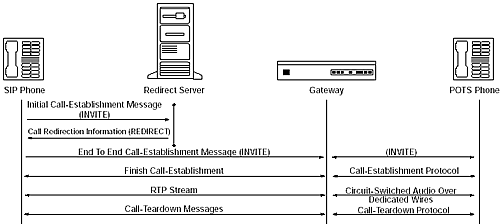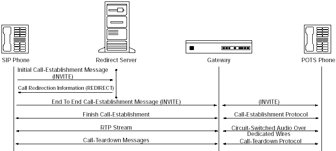 圖5里的重定向服務(wù)器,只處理發(fā)給被叫方的第一個INVITE消息,并反饋一個特殊的回應(yīng)給主叫方。主叫方從回應(yīng)中取出一個新的地址,并給這個地址發(fā)送INVITE消息。這個地址可能是真實的被叫方,代理服務(wù)器或者另一個重定向服務(wù)器。從這以后,所有消息都直接在主叫方和新的地址之間傳遞。