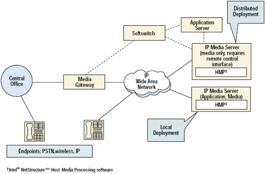 一個IP媒體服務器是在網(wǎng)絡中的終結(jié)IP連接的節(jié)點. 根據(jù)客戶環(huán)境的不同(服務提供商或企業(yè)), IP媒體服務器可以用很多方法來實現(xiàn).