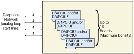 D/4PCIU和D/4PCIUF板卡安裝在計(jì)算機(jī)里(基于Pentium? 處理器的PC) ,可以提供4到64線的集成的,不使用CTbus總線的語音解決方案。