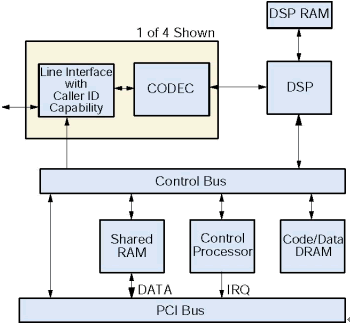 一個(gè)板卡上的微處理器控制D/4PCIU和D/4PCIUF通過一個(gè)本地總線控制板卡所有操作,它從主機(jī)截獲和執(zhí)行命令。這個(gè)微處理器處理實(shí)時(shí)的事件,管理和主機(jī)交互的數(shù)據(jù)流,提高系統(tǒng)的反應(yīng)時(shí)間,減少主機(jī)處理的需求,傳遞給應(yīng)用程序之前處理DTMF和電話信令,把DSP解脫出來專門做信令處理。這個(gè)微處理器和主機(jī)的通信是通過一個(gè)共享RAM,它作為一個(gè)輸入/輸出緩沖區(qū)增加的磁盤文件傳輸?shù)男。這個(gè)RAM和主機(jī)的接口是PCI總線。為了滿足實(shí)時(shí)系統(tǒng)的要求,所有操作的是中斷驅(qū)動(dòng)的。所有安裝在PC里面的D/4PCIUF板卡共享同一個(gè)中斷。在系統(tǒng)初始化的時(shí)候,固件從主機(jī)下載到板卡上的代碼/數(shù)據(jù)