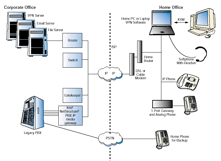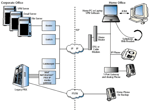 為了實現(xiàn)這個VoIP解決方案,PBX-IP網(wǎng)關(guān)連接到了辦公室里的原有的PBX和關(guān)鍵系統(tǒng)上,還有網(wǎng)守軟件實現(xiàn)一些呼叫的路由以及地址轉(zhuǎn)換。然后遠(yuǎn)程辦公者連接到了網(wǎng)關(guān)上--最終連接到公司PBX上--或者使用IP軟電話,或者一個實際的IP電話,或者一個單端家庭網(wǎng)關(guān)連接到模擬耳機上。