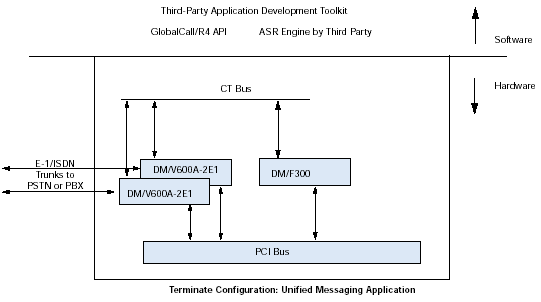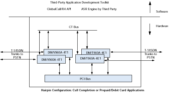 通過訪問計算機電話(CT)工業(yè)標準的ECTF H.100/H.110 CT Bus,利用DM/V-A多功能資源系列板卡,應(yīng)用程序可以具備交換能力以及擴展到其他技術(shù)的能力,諸如網(wǎng)絡(luò)接口(DM/T或者DM/N系列),ATM連接,SS7,以及IP電話。