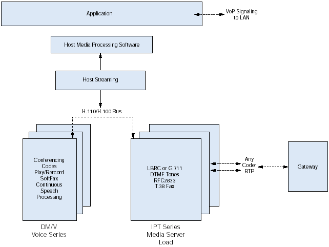 如圖2所示,IPT系列板卡可以通過H.110總線連接到任何一個高密度的Dialogic Dialogic DM/V語音系列媒體處理板卡上。開發(fā)商通過組合IPT系列和DM/V板卡,便可以分發(fā)他們的解決方案,包括語音處理、傳真、講話以及會議功能,這套解決方案可以使每個系統(tǒng)可以從數(shù)以百計(jì)的端口升級到數(shù)以千計(jì)的端口。開發(fā)商也可以選擇使用IPT系列板卡作為高密度接口板卡,并連接到PCI總線使其可以訪問在主機(jī)處理器上執(zhí)行的媒體處理功能。