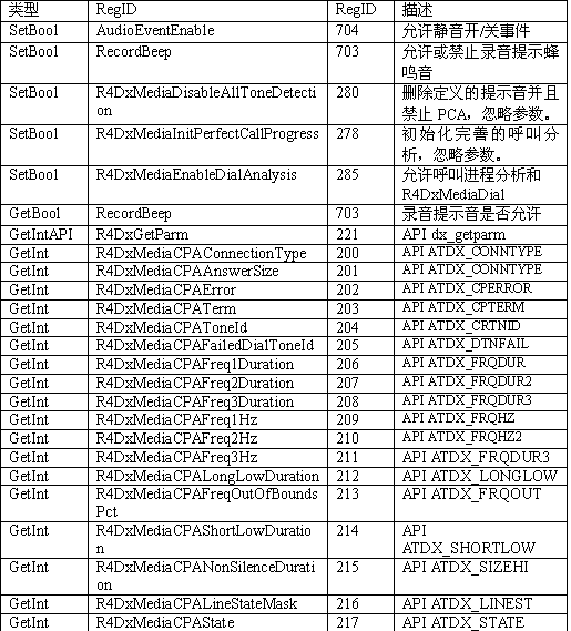必須注意,調(diào)用API級(jí)的函數(shù)設(shè)置一個(gè)CTADE_A參數(shù)可能不只改變電路板級(jí)的參數(shù)。例如,R4DxMedia中,使用函數(shù)MediaSetBool設(shè)置REGID_R4DxMediaDisableAllToneDetection(280)為0或1來清除Dialogic提示音ID。