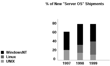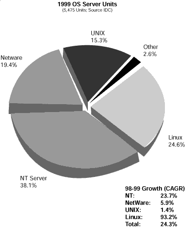而且,在1999年Linux服務器增長率大約在98.3%,遠遠超過居于第二位的Windows的24%的增長率。