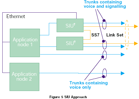 SIU通過從媒介處理中使用以太網(wǎng)分離SS7接口來(lái)處理容錯(cuò)的問題,兩個(gè)SIU作為一個(gè)節(jié)點(diǎn)編碼進(jìn)行容錯(cuò),如圖5所示,通過分離SS7接口,SIU也允許系統(tǒng)最多可以由32個(gè)處理語(yǔ)音電路(媒介)的應(yīng)用節(jié)點(diǎn)組成。